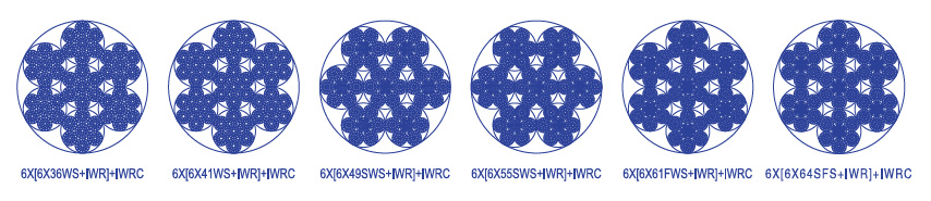 繩結構:6×[6x36WS+IWR]+IWRC 6×[6x36WS+41+IWR]+IWRC 6×[6x49SWS+41+IWR]+IWRC 6×[6x55SWS+IWR]+IWRC 6×[6x61FWS+41+IWR]+IWRC 6×[6x64SWS+41+IWR]+IWRC