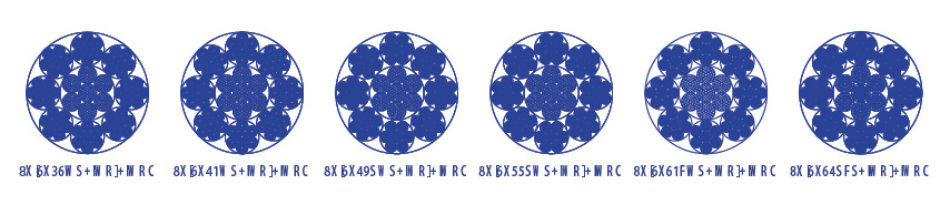 繩結構:8X[6X36WS+IWR]+IWRC 8X[6X41WS+IWR]+IWRC 8X[6X49SWS+IWR]+IWRC 8X[6X55SWS+IWR]+IWRC 8X[6X61FWS+IWR]+IWRC 8X[6X64SFS+IWR]+IWRC