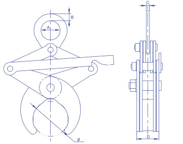| 額定載荷 (t) | 適用范圍 Φ (mm) | 設(shè)計(jì)開口 (mm) | A (mm) | B (mm) | C (mm) | D (mm) |